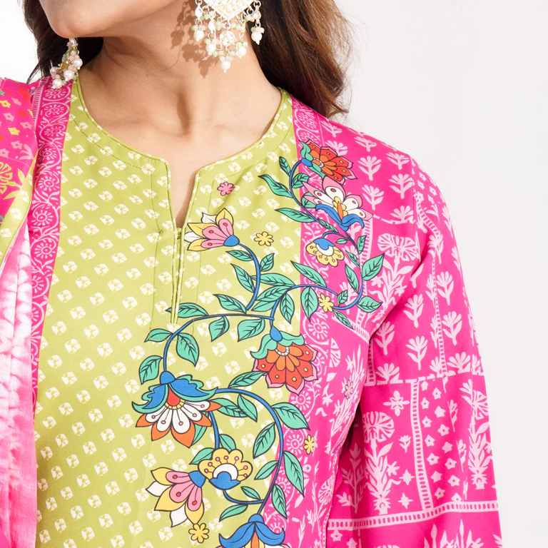 This elegant pink ethnic 3-piece set features a digitally printed kameez paired with solid pants for a balanced, stylish look. The batik cotton orna adds sophistication, complete with a digital printed patch border for extra flair. Made from blended fabric for the kameez and pants, and pure cotton for the orna, this set combines comfort with style, making it perfect for festive occasions or cultural events.
